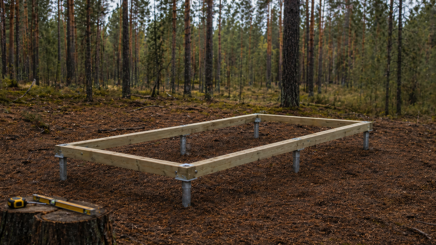 6 винтовых свай 76 мм. Без бетона, без разрешения (до 25 м², правило NT‑12).
