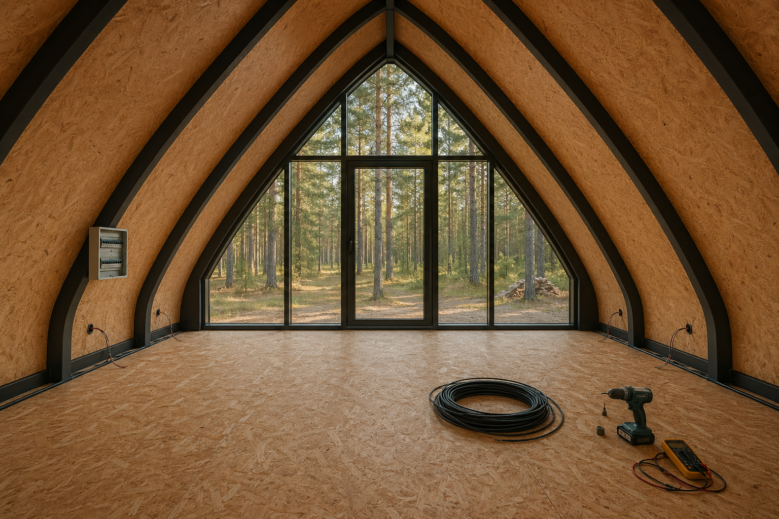 OSB‑3 22 мм, винил‑ламинат, проводка под штукатурку, щиток на 6 линий.