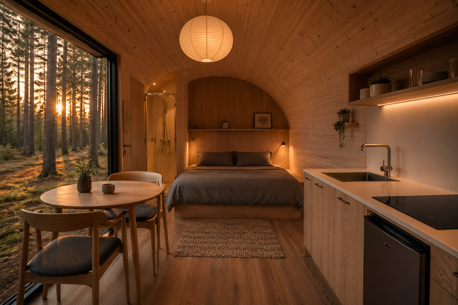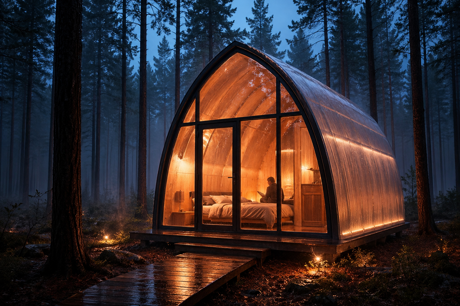 Тёплый свет в арке, сосны вокруг, дождь по стеклу. Booking от €100/ночь.